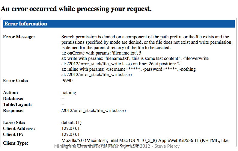 For example, you may be familiar with the article I wrote on file permissions for Lasso 8.[1] This article came about from my frustration with dealing with file permissions. It is not a simple matter, and it is very easy to miss a detail that can lay waste to an afternoon of productivity. It's also easy to misinterpret or not understand the error messages that may be returned.