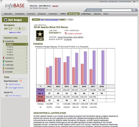 Taking the information the US Government publishes publicly on a yearly basis, placing it in to our database and linking that data to our custom modules tracking Contracts, Companies, Programs, and Customers we are able to provide the end user with a unique insight on what money is slated to go to what companies for what programs in the coming fiscal years.