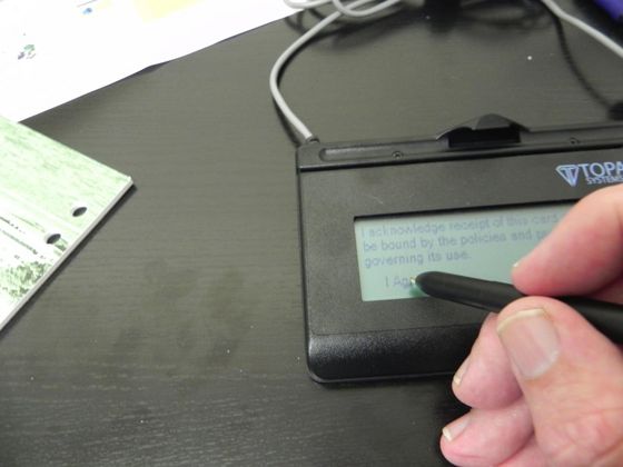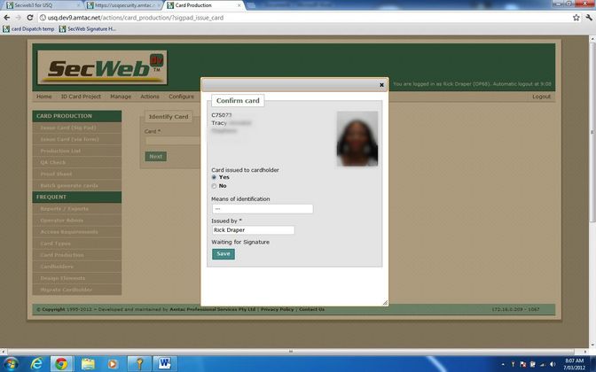 Data from a Contactless Smart Card is scanned into a field on a web form, which when submitted brings up an image of the ID Cardholder in a web page dialogue and triggers a JSONP call to a workstation based web-service that triggers a USB connected digital signature pad. The Cardholder acknowledges the message display on the signature pad LCD and signs for the card. JSONP interaction between the Lasso driven web page and the workstation based web-service presents the signature in the dialogue. The signature is confirmed by clicking the save button on the dialogue and then is submitted in a multipart form for Lasso processing and storage in the applicable database. Viewing details of an issued card shows the signature.