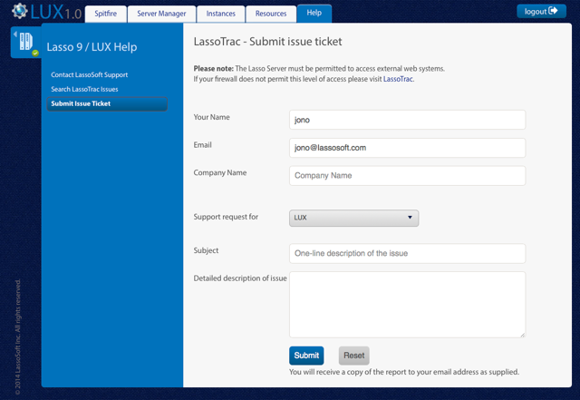 If you find what you consider is an issue with 9.3 or LUX, please log it using "Submit Issue Ticket, and select Lasso 9 (core), LUX (admin), or Documentation (not working as documented).